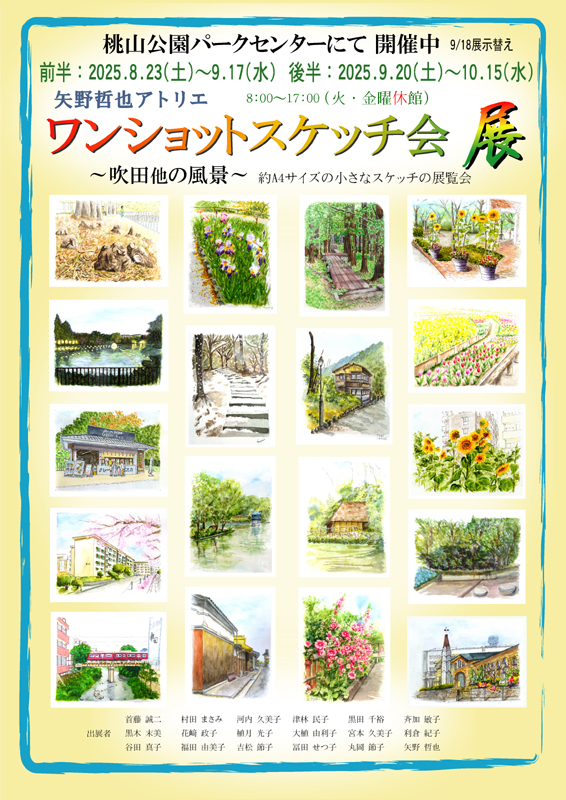 ・吹田市桃山台駅すぐ、桃山公園内「パークセンターにて 今回は途中で展示替えがありました。 前半2025/8/23〜9/17 多くの方に御高覧頂き誠にありがとうございました。 |